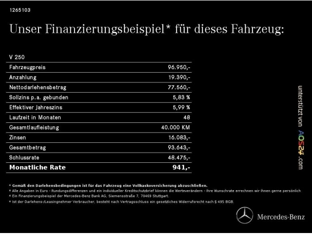Voor zakelijke klanten bieden wij optioneel een financial lease oplossing en voor particuliere klanten een persoonlijke lening. Met onderstaande module kunt u uw maandbedrag berekenen voor het financieren van bovenstaande Mercedes-Benz V 250.