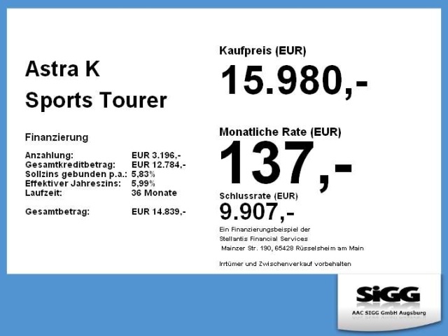 In de Duitse advertentie van deze Opel Astra staat een CO2-uitstoot vermeld van 128 gram per km. Op basis daarvan hebben wij geautomatiseerd een indicatief rest-BPM bedrag van € 1.666 berekend op basis van de afschrijvingstabel van de Belastingdienst. Een handmatige BPM berekening o.b.v. een waardebepaling leidt voor jonge auto's vaak tot een lager rest-BPM bedrag. Vraag hiertoe een offerte aan, vaak kunnen we daar een besparing voor u realiseren. Om hiervoor een fiscaal akkoord te krijgen zal de BPM aangifte worden aangevuld met een waardebepaling taxatierapport. Wij rekenen een fee voor onze bemiddeling hierin. Uiteraard alleen wanneer dit rendabel is.