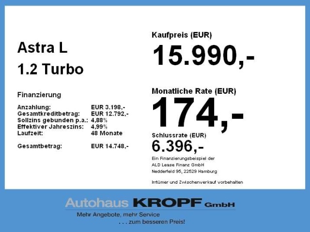 Voor zakelijke klanten bieden wij optioneel een financial lease oplossing en voor particuliere klanten een persoonlijke lening. Met onderstaande module kunt u uw maandbedrag berekenen voor het financieren van bovenstaande Opel Astra.