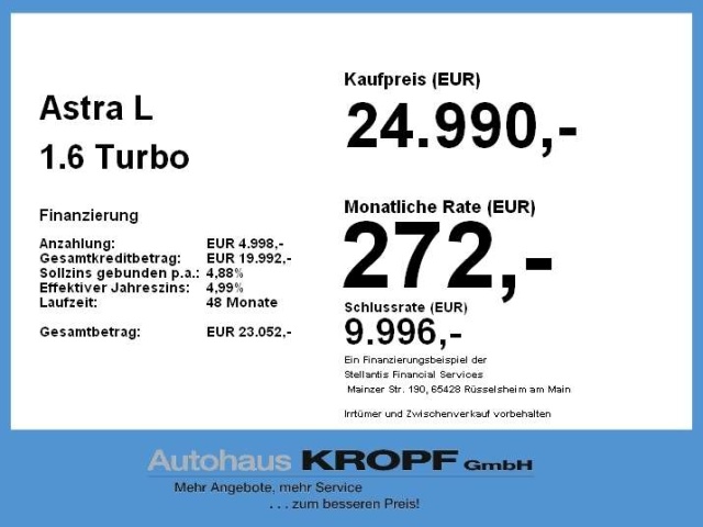 Voor zakelijke klanten bieden wij optioneel een financial lease oplossing en voor particuliere klanten een persoonlijke lening. Met onderstaande module kunt u uw maandbedrag berekenen voor het financieren van bovenstaande Opel Astra.