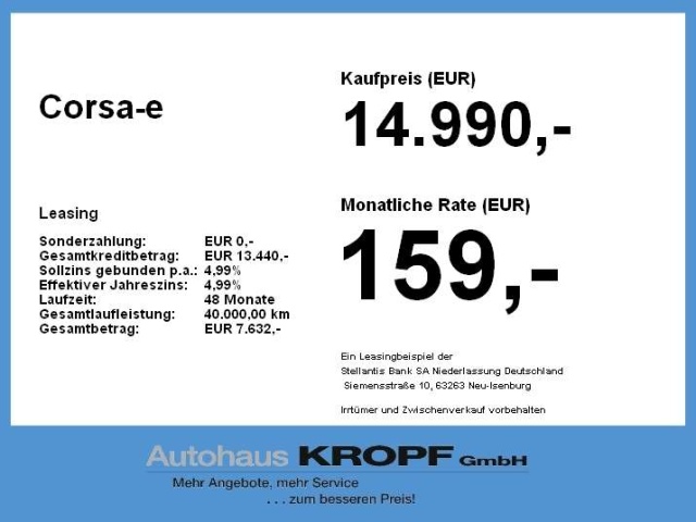 Voor zakelijke klanten bieden wij optioneel een financial lease oplossing en voor particuliere klanten een persoonlijke lening. Met onderstaande module kunt u uw maandbedrag berekenen voor het financieren van bovenstaande Opel Corsa-e.