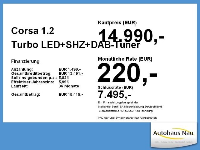 Voor zakelijke klanten bieden wij optioneel een financial lease oplossing en voor particuliere klanten een persoonlijke lening. Met onderstaande module kunt u uw maandbedrag berekenen voor het financieren van bovenstaande Opel Corsa.