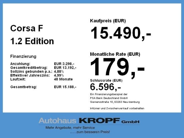 Voor zakelijke klanten bieden wij optioneel een financial lease oplossing en voor particuliere klanten een persoonlijke lening. Met onderstaande module kunt u uw maandbedrag berekenen voor het financieren van bovenstaande Opel Corsa.