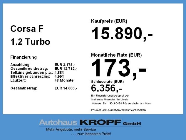 Voor zakelijke klanten bieden wij optioneel een financial lease oplossing en voor particuliere klanten een persoonlijke lening. Met onderstaande module kunt u uw maandbedrag berekenen voor het financieren van bovenstaande Opel Corsa.