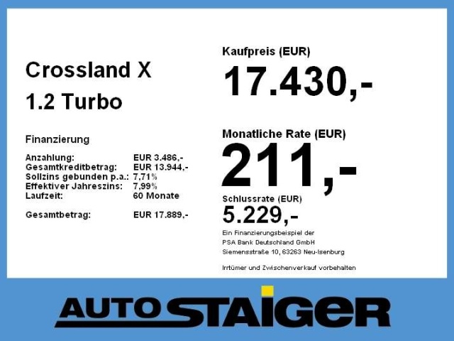 Voor zakelijke klanten bieden wij optioneel een financial lease oplossing en voor particuliere klanten een persoonlijke lening. Met onderstaande module kunt u uw maandbedrag berekenen voor het financieren van bovenstaande Opel Crossland X.