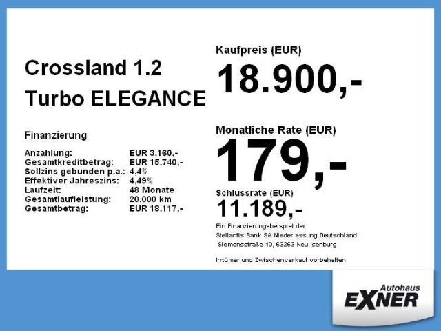 Voor zakelijke klanten bieden wij optioneel een financial lease oplossing en voor particuliere klanten een persoonlijke lening. Met onderstaande module kunt u uw maandbedrag berekenen voor het financieren van bovenstaande Opel Crossland.