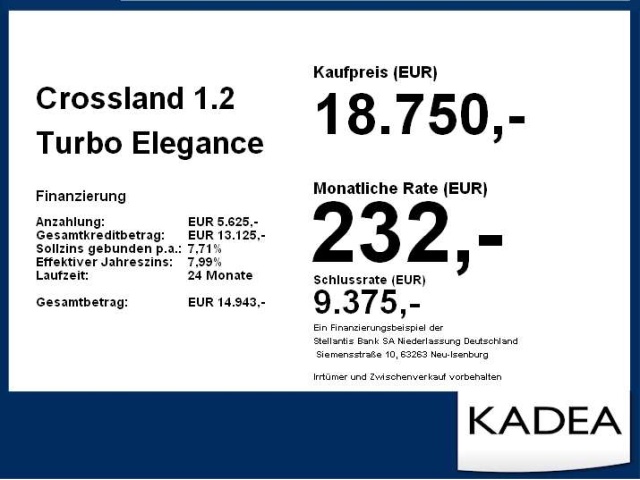 Voor zakelijke klanten bieden wij optioneel een financial lease oplossing en voor particuliere klanten een persoonlijke lening. Met onderstaande module kunt u uw maandbedrag berekenen voor het financieren van bovenstaande Opel Crossland.