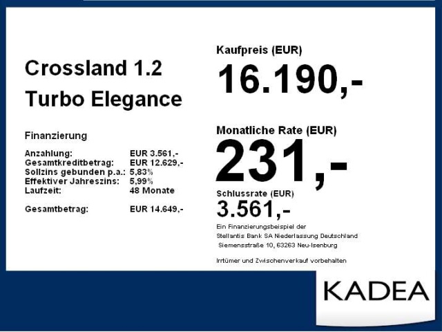 Voor zakelijke klanten bieden wij optioneel een financial lease oplossing en voor particuliere klanten een persoonlijke lening. Met onderstaande module kunt u uw maandbedrag berekenen voor het financieren van bovenstaande Opel Crossland.