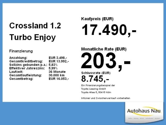 Voor zakelijke klanten bieden wij optioneel een financial lease oplossing en voor particuliere klanten een persoonlijke lening. Met onderstaande module kunt u uw maandbedrag berekenen voor het financieren van bovenstaande Opel Crossland.
