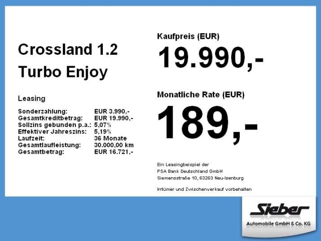Voor zakelijke klanten bieden wij optioneel een financial lease oplossing en voor particuliere klanten een persoonlijke lening. Met onderstaande module kunt u uw maandbedrag berekenen voor het financieren van bovenstaande Opel Crossland.