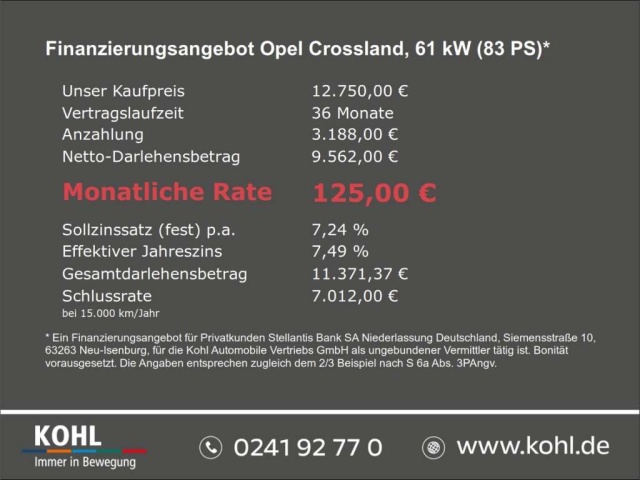 Voor zakelijke klanten bieden wij optioneel een financial lease oplossing en voor particuliere klanten een persoonlijke lening. Met onderstaande module kunt u uw maandbedrag berekenen voor het financieren van bovenstaande Opel Crossland.