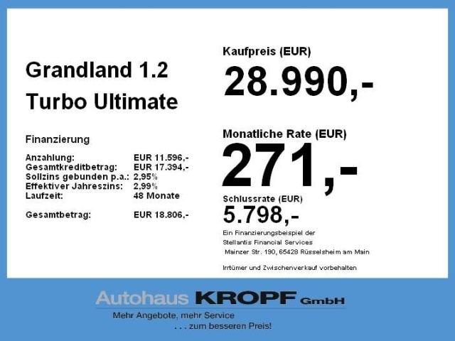 In de Duitse advertentie van deze Opel Grandland staat een CO2-uitstoot vermeld van 146 gram per km. Op basis daarvan hebben wij geautomatiseerd een indicatief rest-BPM bedrag van € 0 berekend op basis van de afschrijvingstabel van de Belastingdienst. Een handmatige BPM berekening o.b.v. een waardebepaling leidt voor jonge auto's vaak tot een lager rest-BPM bedrag. Vraag hiertoe een offerte aan, vaak kunnen we daar een besparing voor u realiseren. Om hiervoor een fiscaal akkoord te krijgen zal de BPM aangifte worden aangevuld met een waardebepaling taxatierapport. Wij rekenen een fee voor onze bemiddeling hierin. Uiteraard alleen wanneer dit rendabel is.