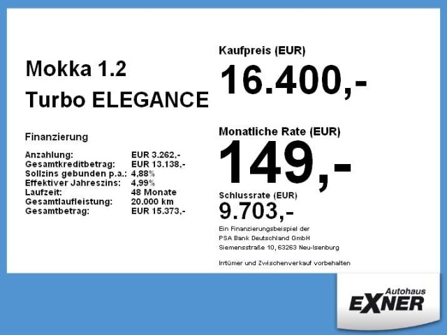 Voor zakelijke klanten bieden wij optioneel een financial lease oplossing en voor particuliere klanten een persoonlijke lening. Met onderstaande module kunt u uw maandbedrag berekenen voor het financieren van bovenstaande Opel Mokka.