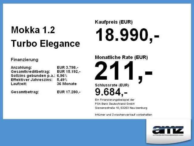 Voor zakelijke klanten bieden wij optioneel een financial lease oplossing en voor particuliere klanten een persoonlijke lening. Met onderstaande module kunt u uw maandbedrag berekenen voor het financieren van bovenstaande Opel Mokka.