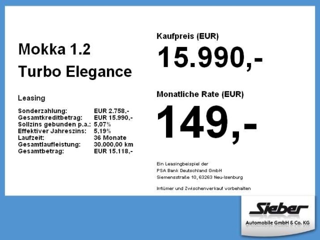 Voor zakelijke klanten bieden wij optioneel een financial lease oplossing en voor particuliere klanten een persoonlijke lening. Met onderstaande module kunt u uw maandbedrag berekenen voor het financieren van bovenstaande Opel Mokka.
