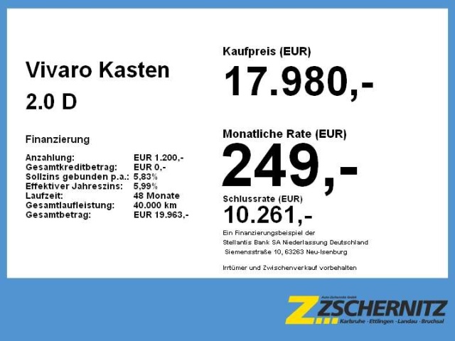 Voor zakelijke klanten bieden wij optioneel een financial lease oplossing en voor particuliere klanten een persoonlijke lening. Met onderstaande module kunt u uw maandbedrag berekenen voor het financieren van bovenstaande Opel Vivaro.