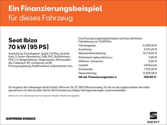 Voor zakelijke klanten bieden wij optioneel een financial lease oplossing en voor particuliere klanten een persoonlijke lening. Met onderstaande module kunt u uw maandbedrag berekenen voor het financieren van bovenstaande Seat Ibiza.