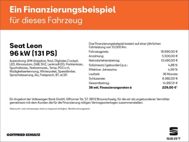 Voor zakelijke klanten bieden wij optioneel een financial lease oplossing en voor particuliere klanten een persoonlijke lening. Met onderstaande module kunt u uw maandbedrag berekenen voor het financieren van bovenstaande Seat Leon.