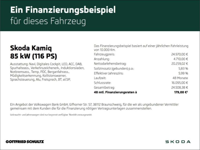Voor zakelijke klanten bieden wij optioneel een financial lease oplossing en voor particuliere klanten een persoonlijke lening. Met onderstaande module kunt u uw maandbedrag berekenen voor het financieren van bovenstaande Skoda Kamiq.