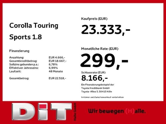 Voor zakelijke klanten bieden wij optioneel een financial lease oplossing en voor particuliere klanten een persoonlijke lening. Met onderstaande module kunt u uw maandbedrag berekenen voor het financieren van bovenstaande Toyota Corolla.
