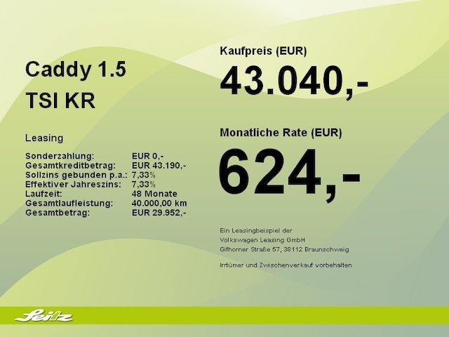 Voor zakelijke klanten bieden wij optioneel een financial lease oplossing en voor particuliere klanten een persoonlijke lening. Met onderstaande module kunt u uw maandbedrag berekenen voor het financieren van bovenstaande Volkswagen Caddy.