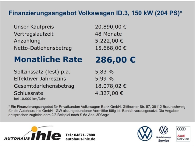 Voor zakelijke klanten bieden wij optioneel een financial lease oplossing en voor particuliere klanten een persoonlijke lening. Met onderstaande module kunt u uw maandbedrag berekenen voor het financieren van bovenstaande Volkswagen ID.3.
