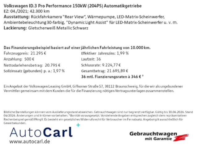 Deze Volkswagen ID.3 staat te koop in Duitsland bij een officiële Volkswagen dealer. Wanneer u gebruik maakt van onze auto import service dan regelen wij het aankoopproces samen met u. U tekent en betaalt zelf. U bent in de meeste gevallen ook juridisch de koper. Dat kan belangrijk zijn voor garantie, rechtspositie en de lagere Duitse btw.