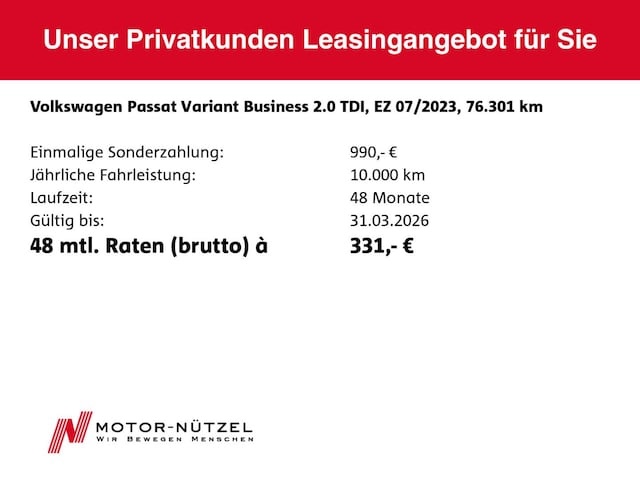 Voor zakelijke klanten bieden wij optioneel een financial lease oplossing en voor particuliere klanten een persoonlijke lening. Met onderstaande module kunt u uw maandbedrag berekenen voor het financieren van bovenstaande Volkswagen Passat Variant.