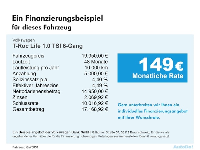 Voor zakelijke klanten bieden wij optioneel een financial lease oplossing en voor particuliere klanten een persoonlijke lening. Met onderstaande module kunt u uw maandbedrag berekenen voor het financieren van bovenstaande Volkswagen T-Roc.