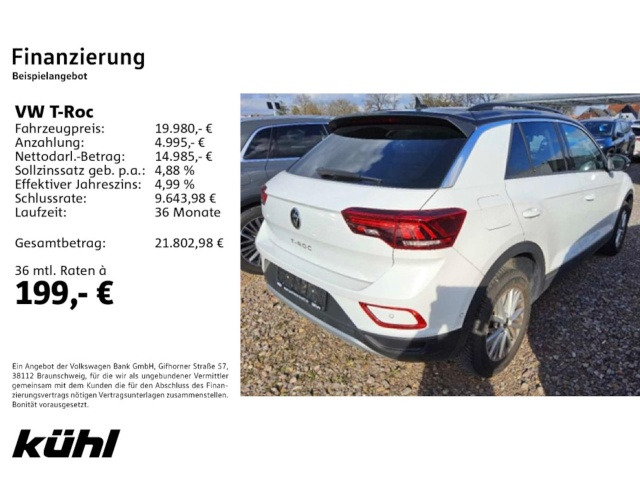 Voor zakelijke klanten bieden wij optioneel een financial lease oplossing en voor particuliere klanten een persoonlijke lening. Met onderstaande module kunt u uw maandbedrag berekenen voor het financieren van bovenstaande Volkswagen T-Roc.