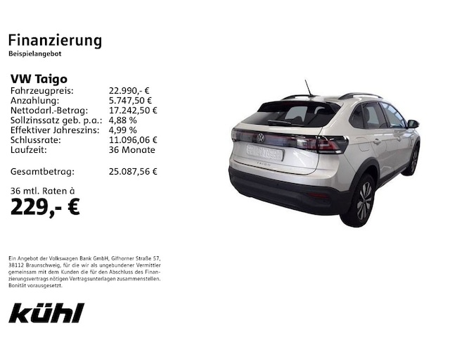 Voor zakelijke klanten bieden wij optioneel een financial lease oplossing en voor particuliere klanten een persoonlijke lening. Met onderstaande module kunt u uw maandbedrag berekenen voor het financieren van bovenstaande Volkswagen Taigo.