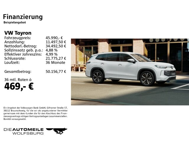 Voor zakelijke klanten bieden wij optioneel een financial lease oplossing en voor particuliere klanten een persoonlijke lening. Met onderstaande module kunt u uw maandbedrag berekenen voor het financieren van bovenstaande Volkswagen Tayron.