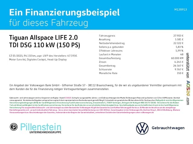 Voor zakelijke klanten bieden wij optioneel een financial lease oplossing en voor particuliere klanten een persoonlijke lening. Met onderstaande module kunt u uw maandbedrag berekenen voor het financieren van bovenstaande Volkswagen Tiguan Allspace.