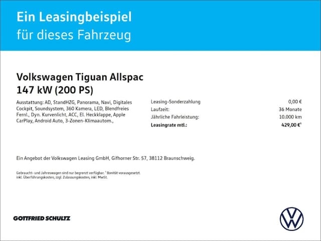 Voor zakelijke klanten bieden wij optioneel een financial lease oplossing en voor particuliere klanten een persoonlijke lening. Met onderstaande module kunt u uw maandbedrag berekenen voor het financieren van bovenstaande Volkswagen Tiguan Allspace.