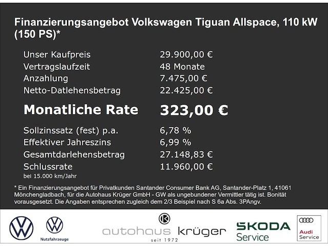 Voor zakelijke klanten bieden wij optioneel een financial lease oplossing en voor particuliere klanten een persoonlijke lening. Met onderstaande module kunt u uw maandbedrag berekenen voor het financieren van bovenstaande Volkswagen Tiguan Allspace.