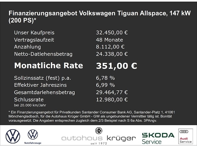 Voor zakelijke klanten bieden wij optioneel een financial lease oplossing en voor particuliere klanten een persoonlijke lening. Met onderstaande module kunt u uw maandbedrag berekenen voor het financieren van bovenstaande Volkswagen Tiguan Allspace.