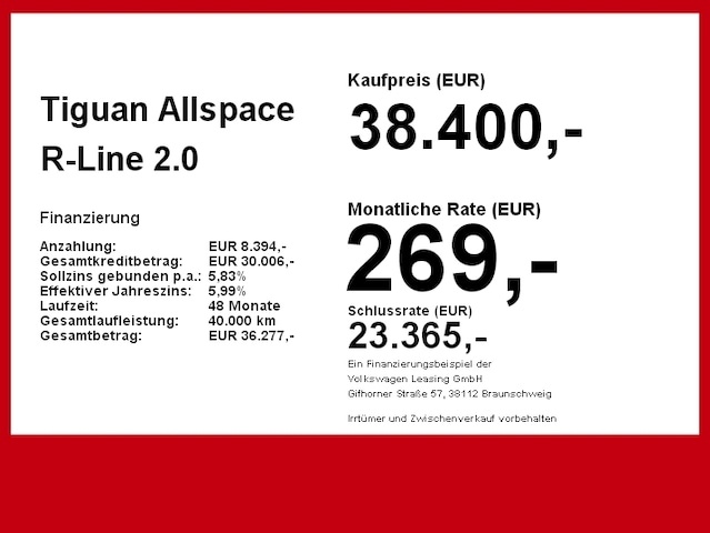 Voor zakelijke klanten bieden wij optioneel een financial lease oplossing en voor particuliere klanten een persoonlijke lening. Met onderstaande module kunt u uw maandbedrag berekenen voor het financieren van bovenstaande Volkswagen Tiguan Allspace.