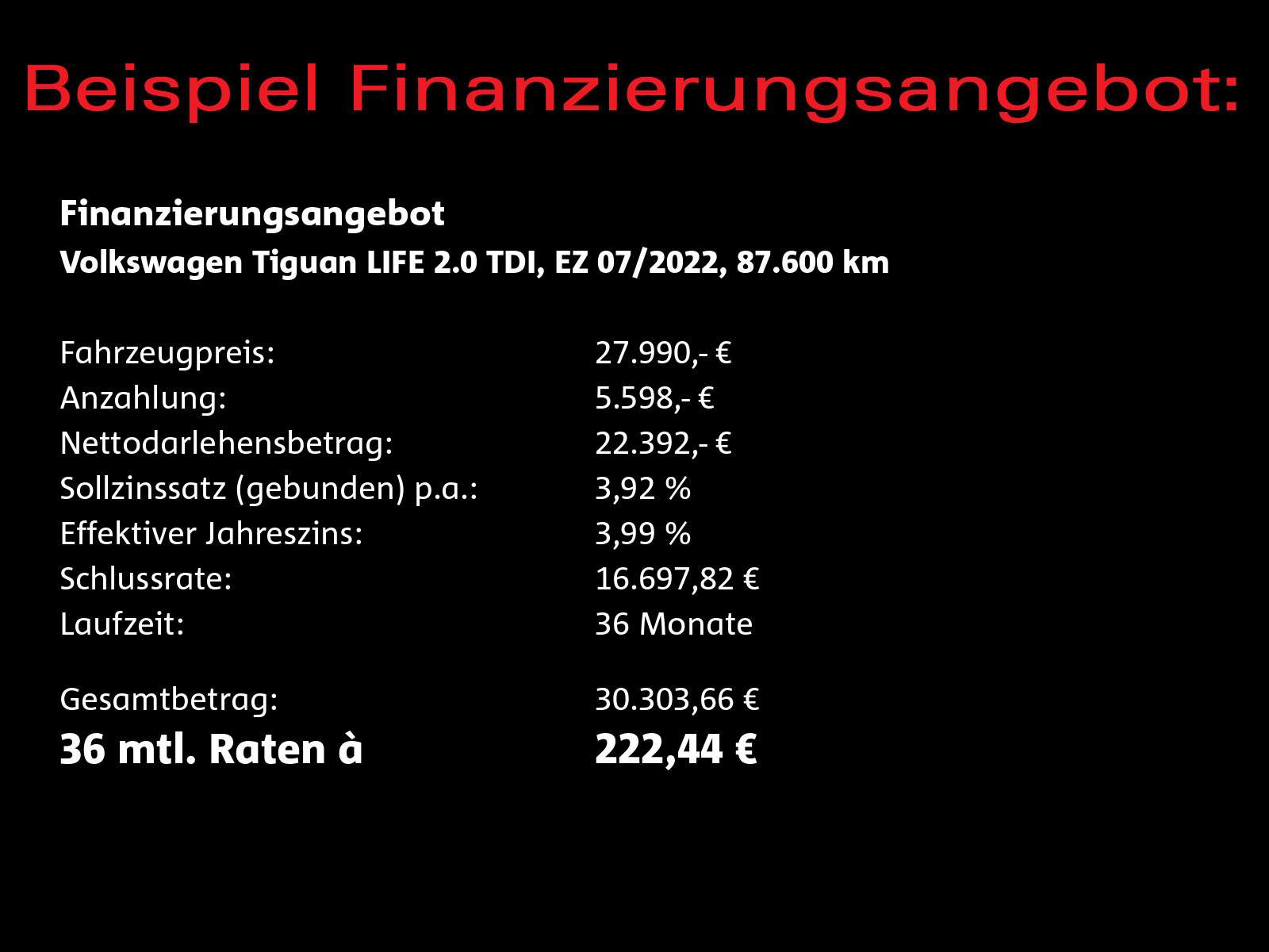 Voor zakelijke klanten bieden wij optioneel een financial lease oplossing en voor particuliere klanten een persoonlijke lening. Met onderstaande module kunt u uw maandbedrag berekenen voor het financieren van bovenstaande Volkswagen Tiguan.