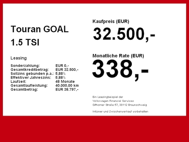 Voor zakelijke klanten bieden wij optioneel een financial lease oplossing en voor particuliere klanten een persoonlijke lening. Met onderstaande module kunt u uw maandbedrag berekenen voor het financieren van bovenstaande Volkswagen Touran.