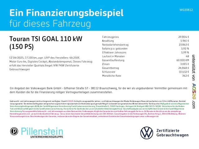 Voor zakelijke klanten bieden wij optioneel een financial lease oplossing en voor particuliere klanten een persoonlijke lening. Met onderstaande module kunt u uw maandbedrag berekenen voor het financieren van bovenstaande Volkswagen Touran.