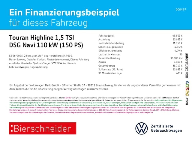Voor zakelijke klanten bieden wij optioneel een financial lease oplossing en voor particuliere klanten een persoonlijke lening. Met onderstaande module kunt u uw maandbedrag berekenen voor het financieren van bovenstaande Volkswagen Touran.