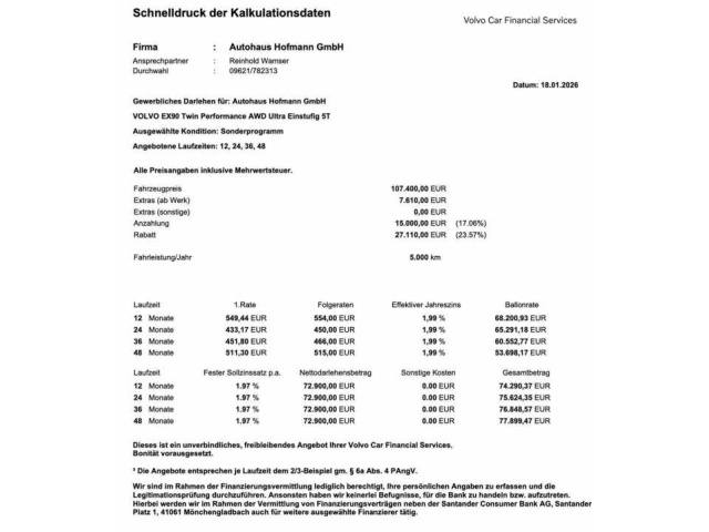 Voor zakelijke klanten bieden wij optioneel een financial lease oplossing en voor particuliere klanten een persoonlijke lening. Met onderstaande module kunt u uw maandbedrag berekenen voor het financieren van bovenstaande Volvo EX90.