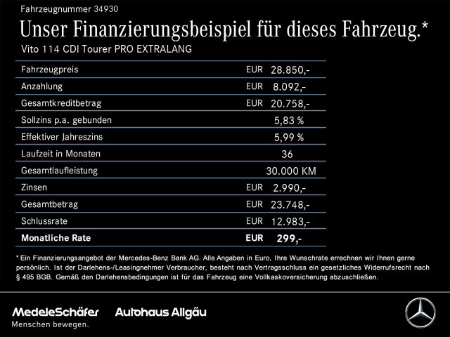 Voor zakelijke klanten bieden wij optioneel een financial lease oplossing en voor particuliere klanten een persoonlijke lening. Met onderstaande module kunt u uw maandbedrag berekenen voor het financieren van bovenstaande Mercedes-Benz Vito.