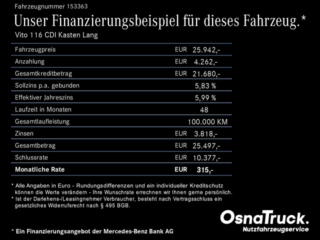 Voor zakelijke klanten bieden wij optioneel een financial lease oplossing en voor particuliere klanten een persoonlijke lening. Met onderstaande module kunt u uw maandbedrag berekenen voor het financieren van bovenstaande Mercedes-Benz Vito.