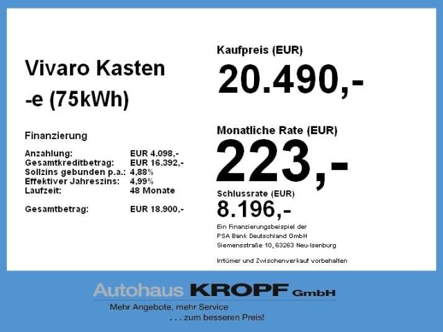 Voor zakelijke klanten bieden wij optioneel een financial lease oplossing en voor particuliere klanten een persoonlijke lening. Met onderstaande module kunt u uw maandbedrag berekenen voor het financieren van bovenstaande Opel Vivaro.