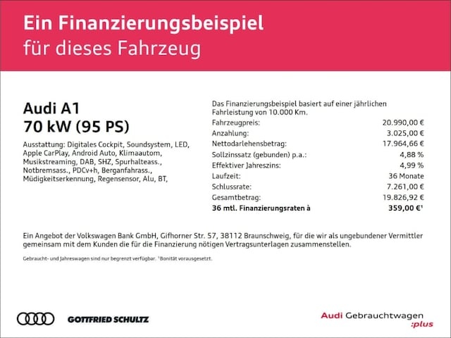 Voor zakelijke klanten bieden wij optioneel een financial lease oplossing en voor particuliere klanten een persoonlijke lening. Met onderstaande module kunt u uw maandbedrag berekenen voor het financieren van bovenstaande Audi A1.