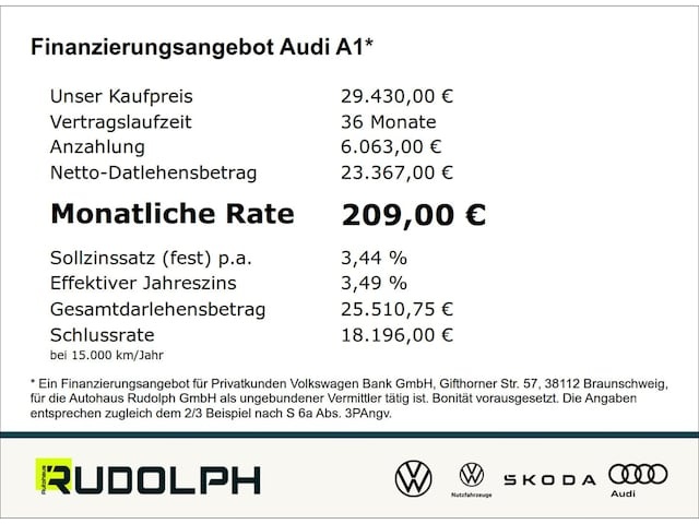 Voor zakelijke klanten bieden wij optioneel een financial lease oplossing en voor particuliere klanten een persoonlijke lening. Met onderstaande module kunt u uw maandbedrag berekenen voor het financieren van bovenstaande Audi A1.