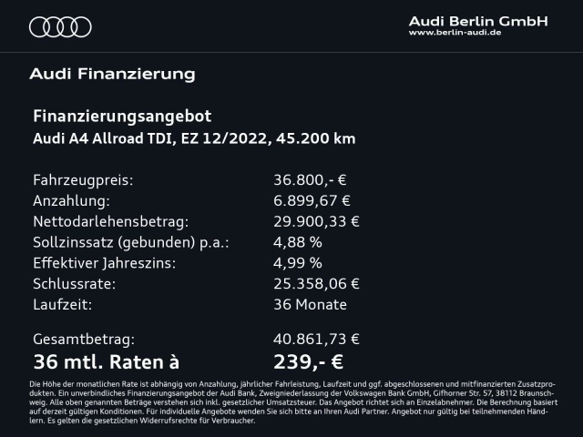 Voor zakelijke klanten bieden wij optioneel een financial lease oplossing en voor particuliere klanten een persoonlijke lening. Met onderstaande module kunt u uw maandbedrag berekenen voor het financieren van bovenstaande Audi A4 allroad.