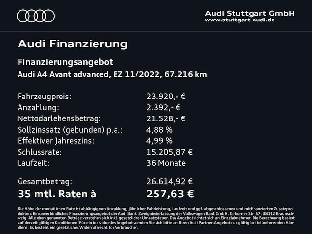 Voor zakelijke klanten bieden wij optioneel een financial lease oplossing en voor particuliere klanten een persoonlijke lening. Met onderstaande module kunt u uw maandbedrag berekenen voor het financieren van bovenstaande Audi A4.