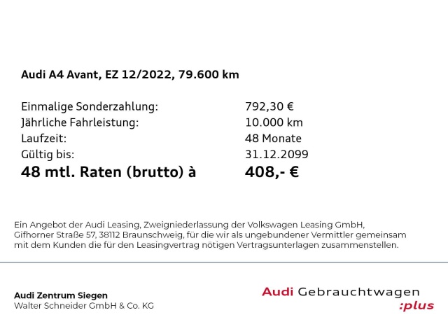 Voor zakelijke klanten bieden wij optioneel een financial lease oplossing en voor particuliere klanten een persoonlijke lening. Met onderstaande module kunt u uw maandbedrag berekenen voor het financieren van bovenstaande Audi A4.